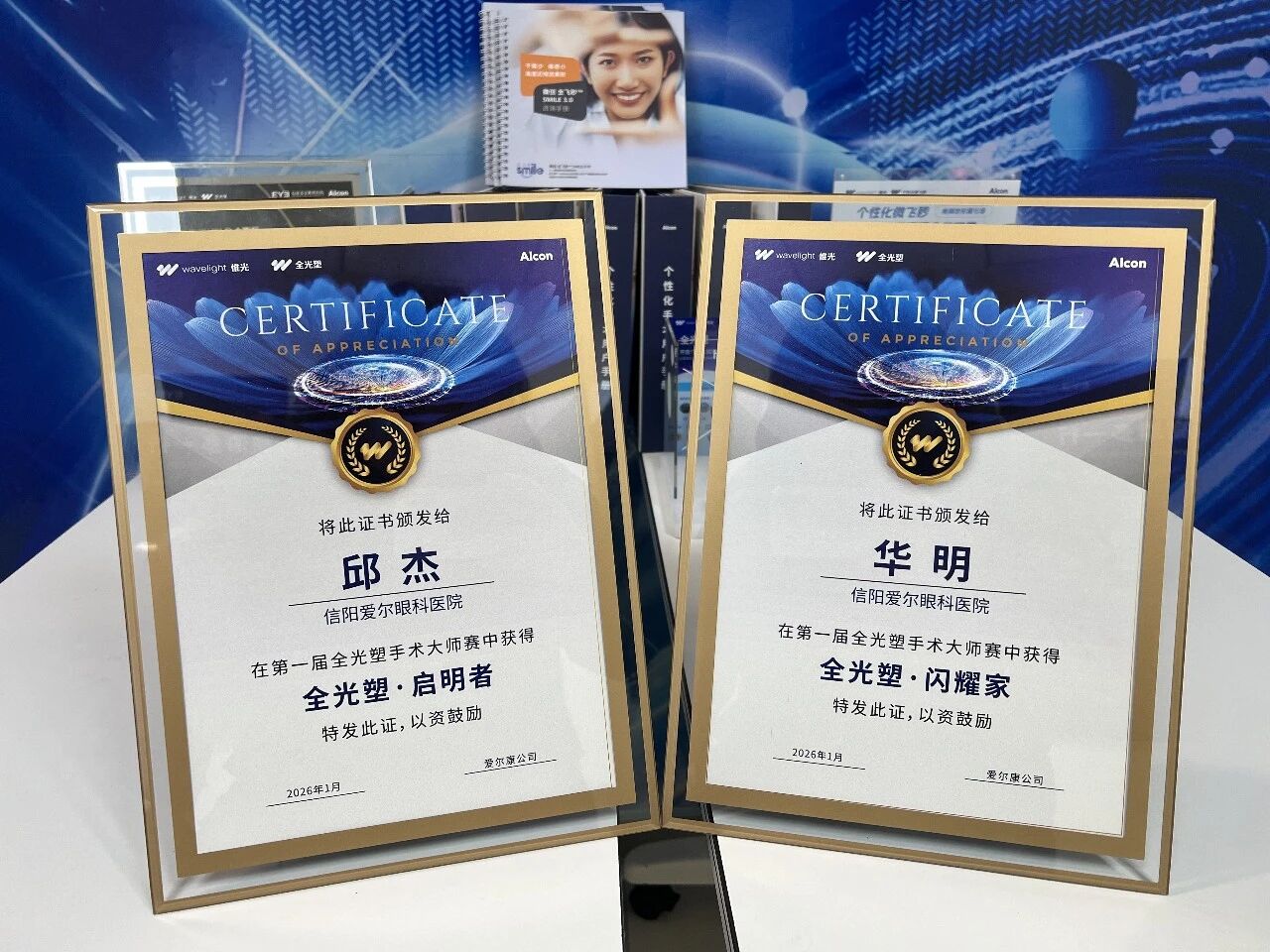 喜报传来,载誉而归!2026年1月17日,由爱尔康主办的中国屈光手术领域年度盛会——“全力绽放·光塑问鼎”第一届全光塑手术大师赛全国总决赛在北京圆满落幕。信阳爱尔眼科医院华明院长、邱杰主任凭借扎实的临床功底、精湛的手术技艺与创新的诊疗理念,从全国众多顶尖眼科专家中脱颖而出,分别斩获“全光塑·闪耀家”与“全光塑·启明者”重量级荣誉,为信阳眼科界赢得殊荣!